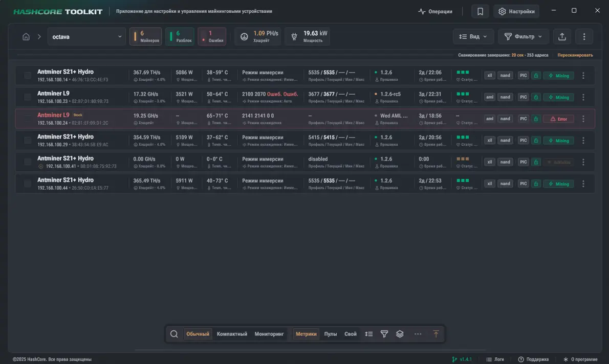 Программа предлагает удобный и простой способ управления майнинговыми устройствами, обеспечивая полный контроль над производительностью оборудования. С HASHCORE TOOLKIT вы сможете легко отслеживать состояние своих устройств, оптимизировать их производительность и поддерживать стабильность системы.